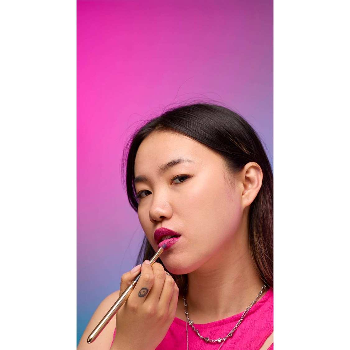Using our Pucker brush, apply a colour straight to your lips, or use the space in the middle to blend and create your perfect base.